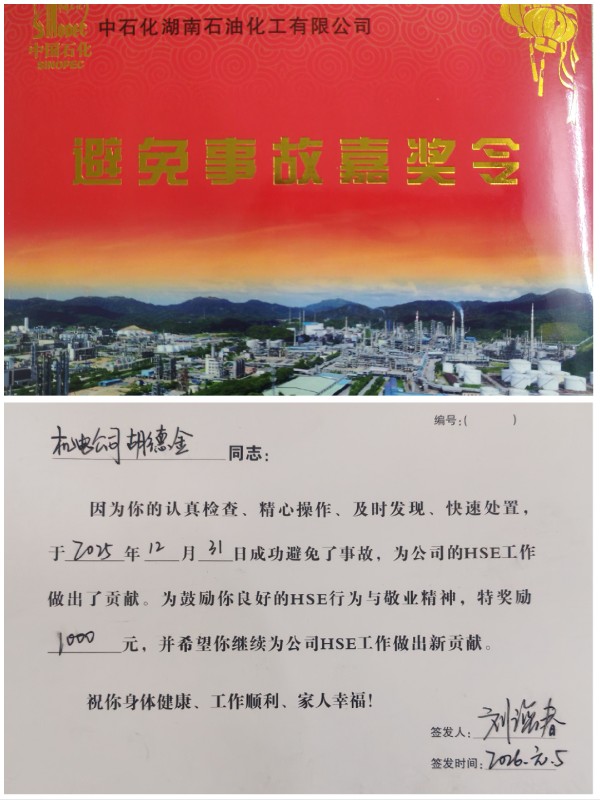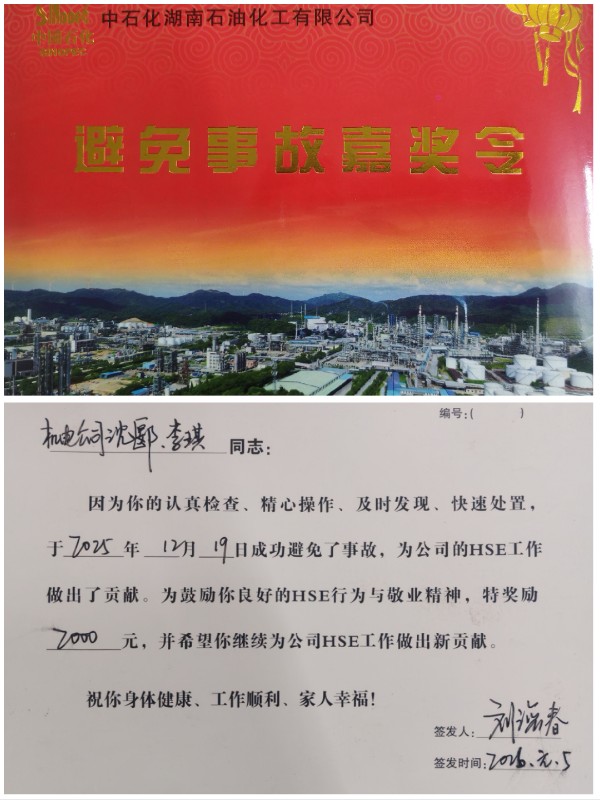 2026年1月6日上午,湖南石化设备管理部经理刘海春一行专程来到机修二班,为胡德金、沈郾、李琪三名员工颁发避免事故嘉奖令,表彰他们凭借高度的责任意识与专业素养,成功发现并处置两起重大安全隐患,为装置安全生产筑牢坚实的安全防线,树立起全员践行“隐患零容忍”的实干标杆。